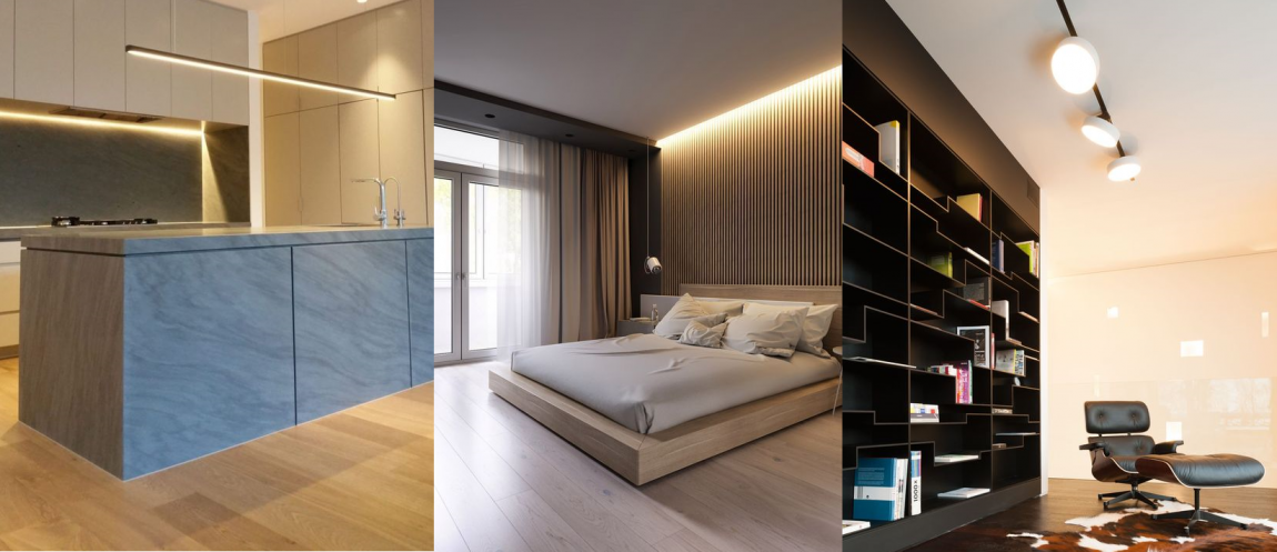 Световое зонирование пространства. Этот прием подходит кухонь-студий, открытых офисов. Лампы с холодным, теплым или нейтральным светом размещают в отдельных функциональных зонах