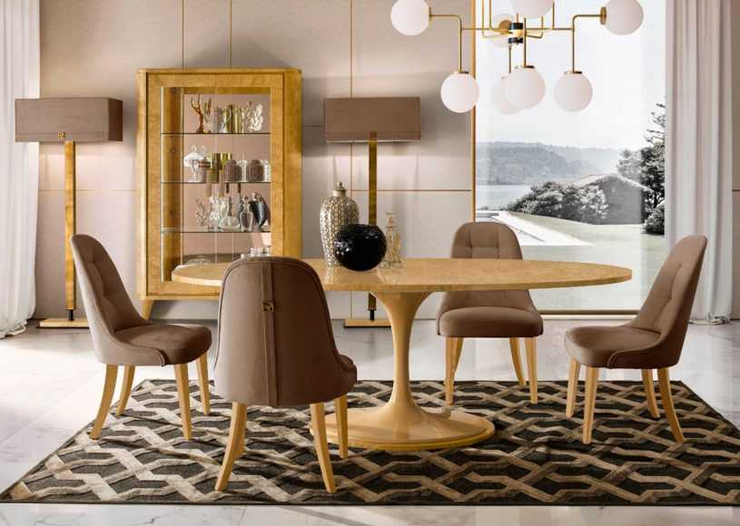 Другой вариант – подобрать внешний вид буфета под стиль и цвет мебели в гостиной или столовой. Это может быть тот же вид древесины, что и у обеденного стола. Или чтобы оттенок фасада шкафа совпадал с цветом спинок стульев. Возможно, фрезеровка буфета перекликается с линиями на ножках остальной мебели.
