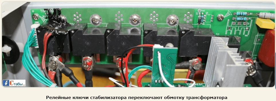 В релейных стабилизаторах встроенная автоматика выполняет отключение и подключение витков коммутатора работы, до тех пор, пока не будет получено оптимальное напряжение на выходе. Для ускорения работы аппарата все витки трансформатора поделены на подгруппы, что позволяет улучшить амплитуду напряжения, упрощая при этом работу аппарата. Стабилизаторы этого типа отличаются надежностью, что объясняется простотой конструкции. К минусам можно отнести небольшую скорость выпрямления напряжения, поэтому с чувствительными приборами использовать их не рекомендуется.