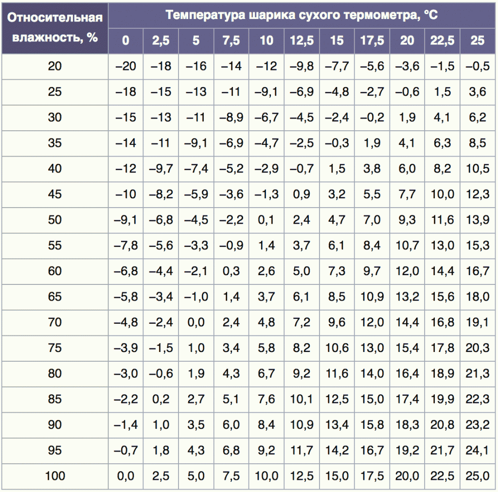Специалисты разработали таблицу для моментальных вычислений. Следует учитывать, что в таблице приведены приблизительные данные. В ней указаны температура и влажность, а на их пересечении вы найдёте точку росы.