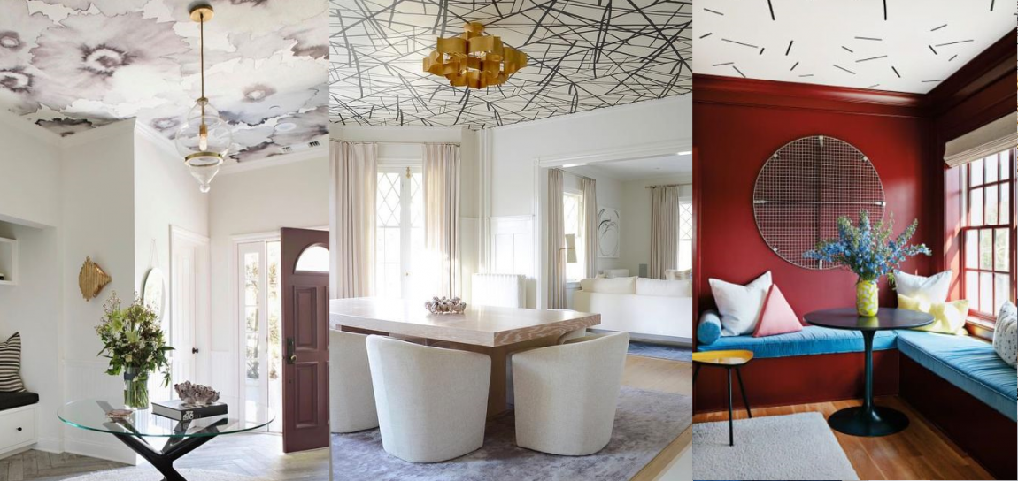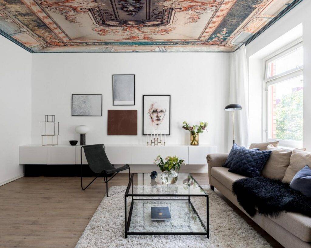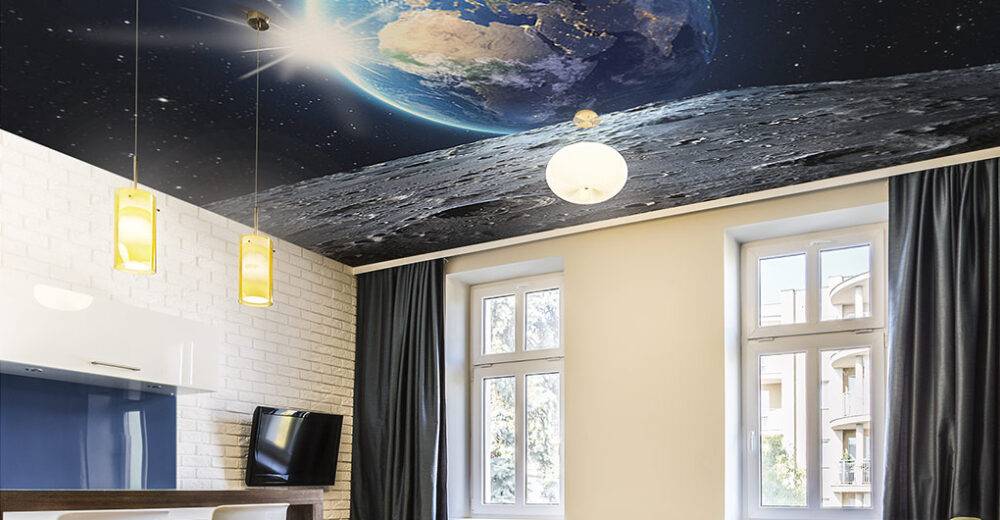 Обои и фотообои для потолка в гостиной