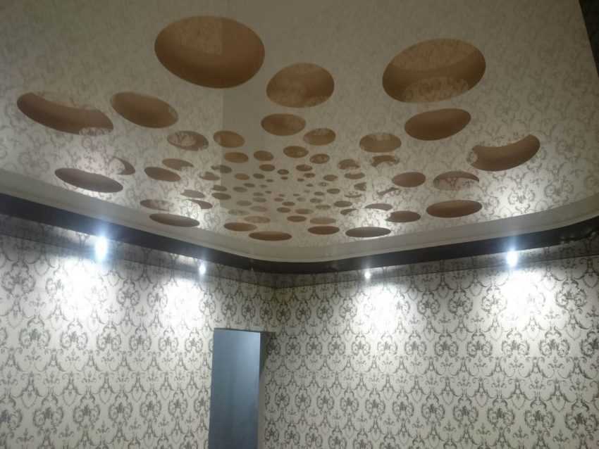 современного ремонта, советуем до лакового ПВХ-потолка поклеить серые узорчатые