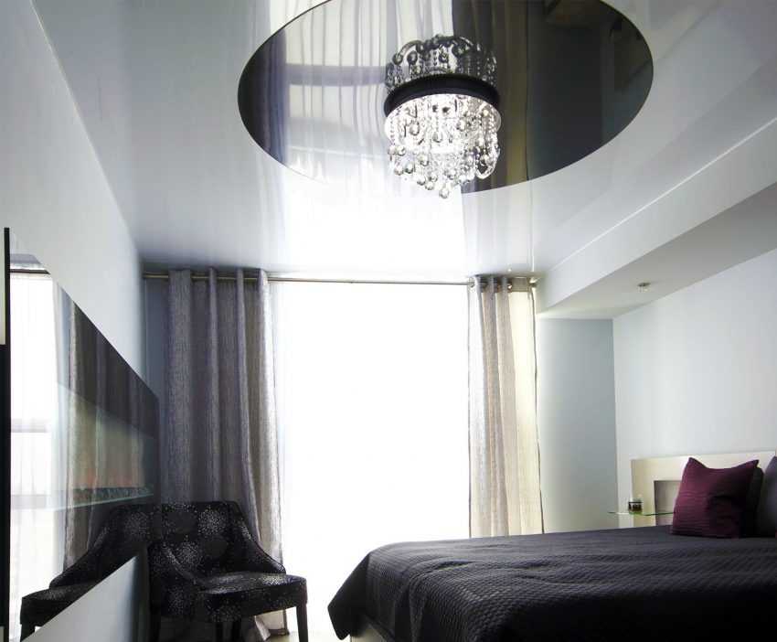1) Сочетание нескольких типов потолочного полотна является прекрасным решением. В таком случае поверхность можно оформить, использовав различные по цвету либо по фактуре полотна. Прекрасно комбинируется матовое полотно по краям с глянцевым в центре. Подобный вариант также позволяет зрительно увеличить высоту помещения.