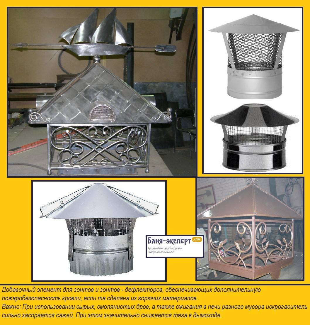 Основные отличия заключаются в форме конструкции и количестве составляющих. Материалом для изготовления таких устройств является нержавеющая и оцинкованная сталь, реже – медь. По форме они бывают цилиндрическими, квадратными, круглыми, открытого и закрытого типа. Устройства одного вида могут отличаться в верхней части: одни изделия выполняются с конусообразным зонтиком, другие имеют двускатную или вальмовую крышу, третьи делают плоскими или с декоративными фигурными элементами.