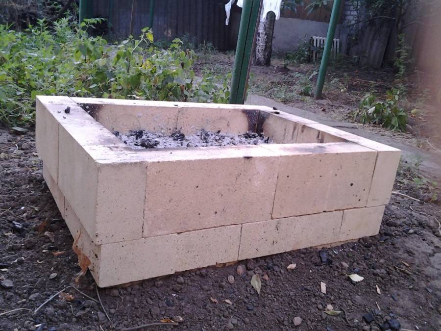 Уровень всех стенок может быть одинаковым, или короткие стенки выкладываются выше – для защиты от бокового ветра. Помимо обычного кирпича, используют также шлакоблоки, пеноблоки и другие блочные материалы. Возможно использование дикого камня.