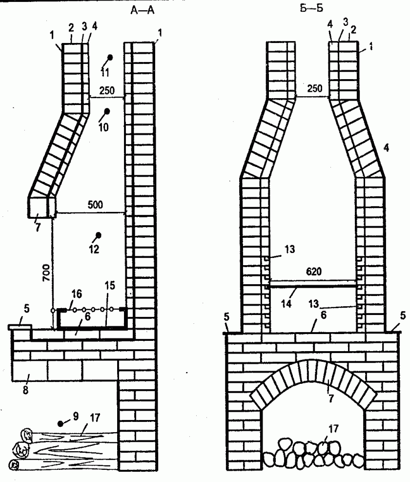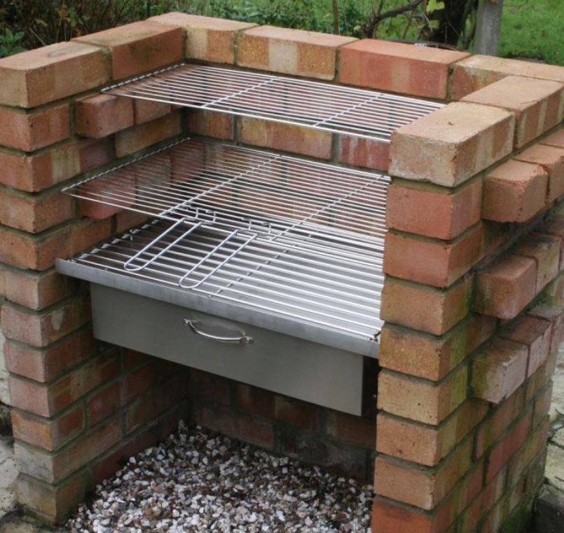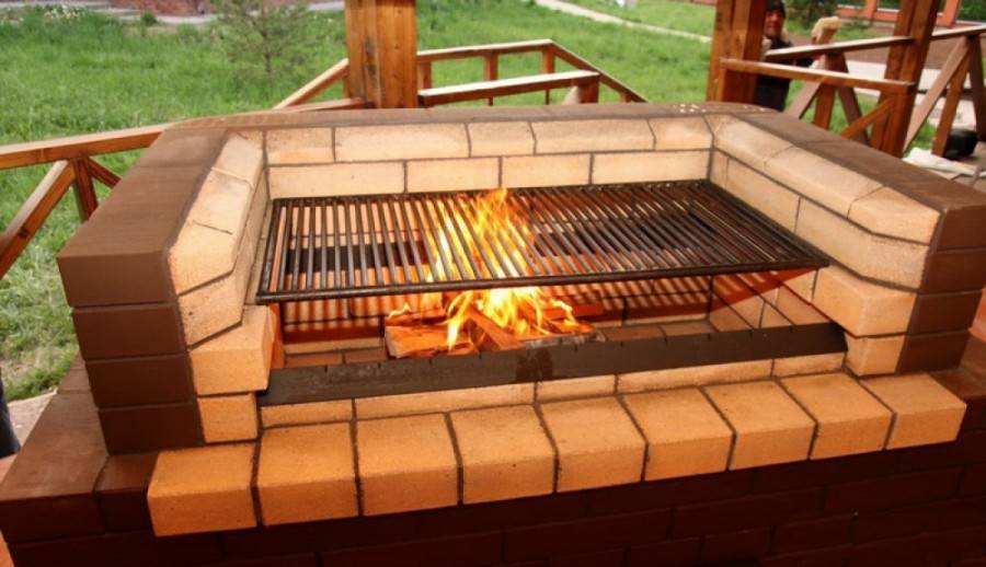 Это просто выложенный из кирпича прямоугольник. Дно может быть также выложено кирпичом – тогда золу с него придется выгребать подручными приспособлениями – или, как на фото выше, с решеткой. В этом случае необходимо предусмотреть дверцу в одной из боковых стенок (обычно она заменяет два-четыре кирпича) для выгребания золы из-под решетки. Шампуры или решетка для жарки укладываются прямо поверх кирпичных стенок.