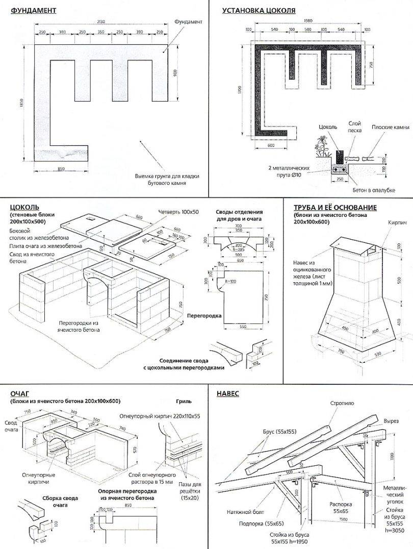 Когда выбрано место и определены размеры барбекю на дачном участке, чертеж должен быть составлен так, чтобы стали понятными тонкости создания уличного очага. В качестве основы для кирпичного или каменного мангала может быть использована порядовая схема печи-грубки. Если хочется построить очаг необычной формы (круглый, в виде камина, сварить из металла и т.п.), то чертежи придется создавать самостоятельно.
