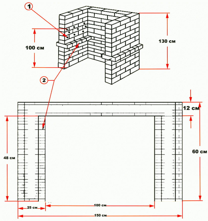 - опорные стенки. Самые простые мангалы строятся в виде буквы «П» — две боковые стенки, на которые опирается решетка, и задняя. Она не только закрывает угли и мясо на решетке от ветра, но и «связывает» боковые стенки, придает конструкции прочность;