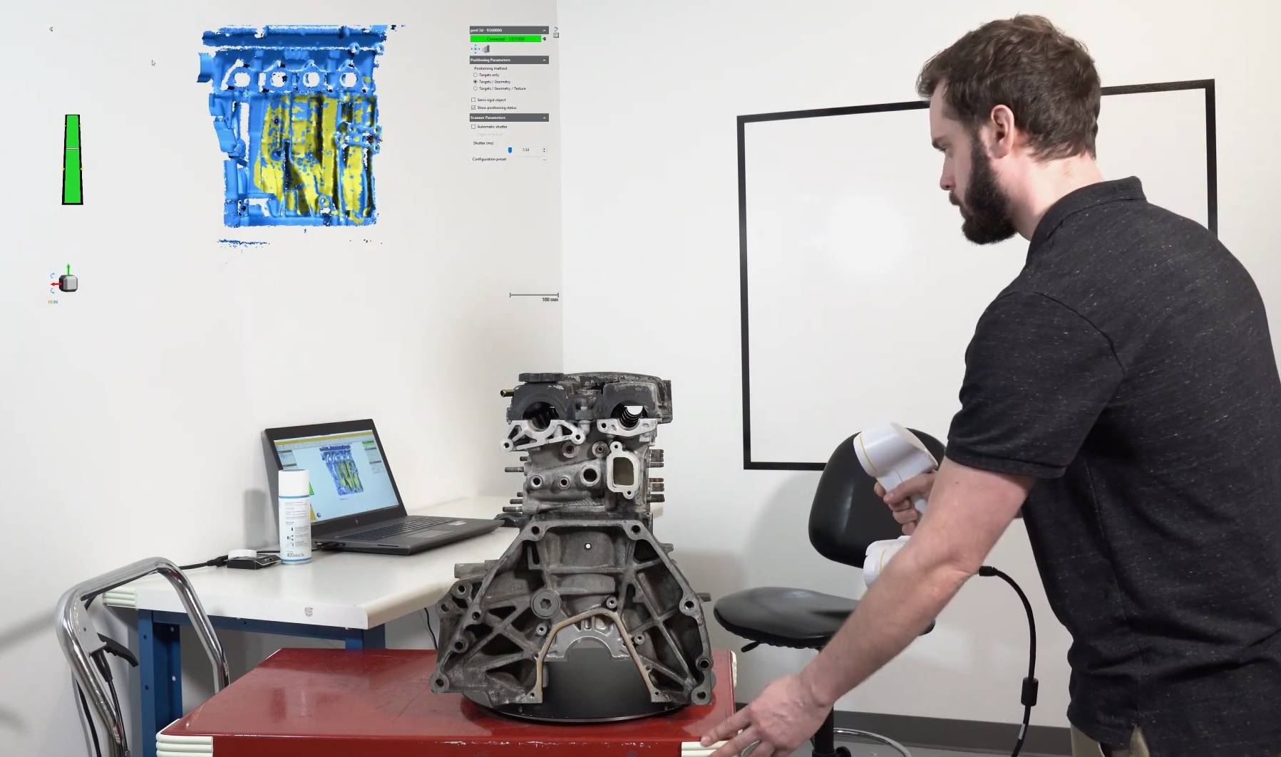 На блестящие элементы можно нанести матирующий спрей, что позволит отсканировать их вместе с остальными за одну сессию. Также можно наклеить на объект несколько позиционных меток, это поможет сканированию. Геометрия этой детали не требует меток, но мы их используем, поскольку это рекомендуется и позволяет повторно отсканировать объект, если какие-то части оказались пропущены.
