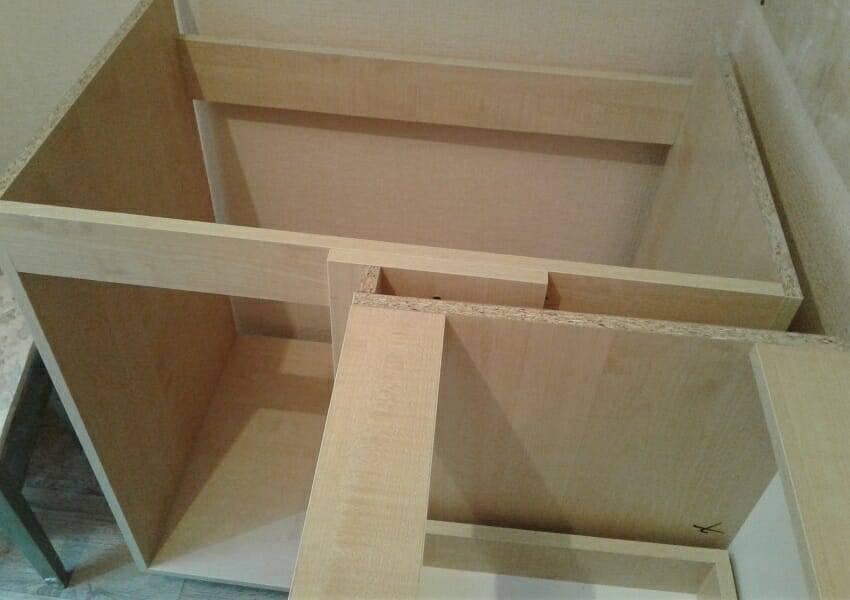 Аналогично крепят и кухонную столешницу – притягивают изнутри на длинные саморезы 3х25 или 4х30. Предварительно планки засверливают, сверлом толщиной 5 мм. Единственный нюанс для кухонной столешницы — это крепление планок в местах, где подразумевается врез мойки или варочной поверхности. В этих столах-тумбах планки разворачивают торцом, чтобы они не мешали врезу. Или не ставят вообще.