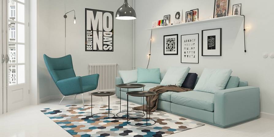 Удачно впишется в интерьер в скандинавском стиле и диван голубого или синего оттенка. Например, можно сделать основной акцент в помещении на диван. Тогда стены, пол и остальные предметы мебели должны быть выполнены в нейтральных цветах.
