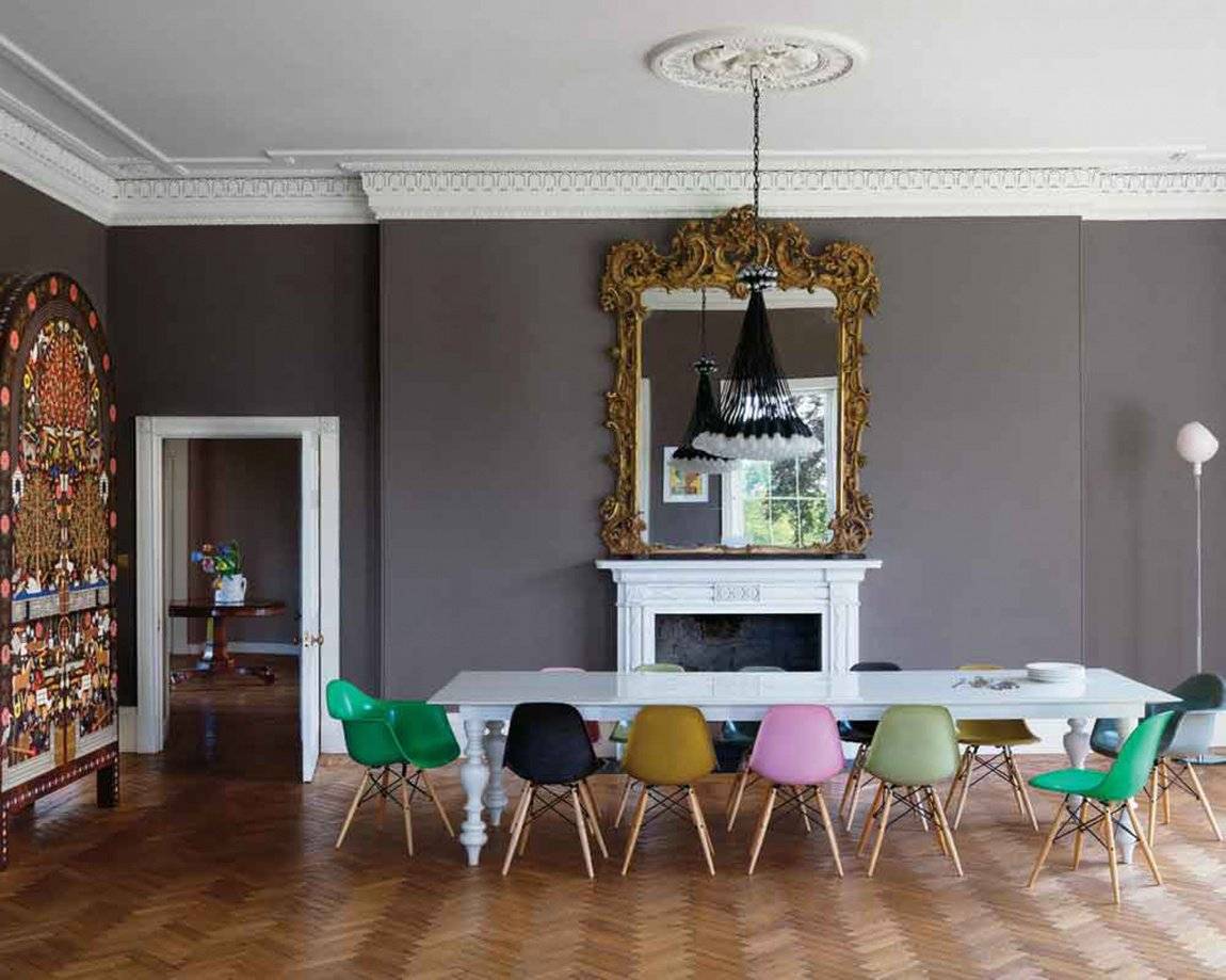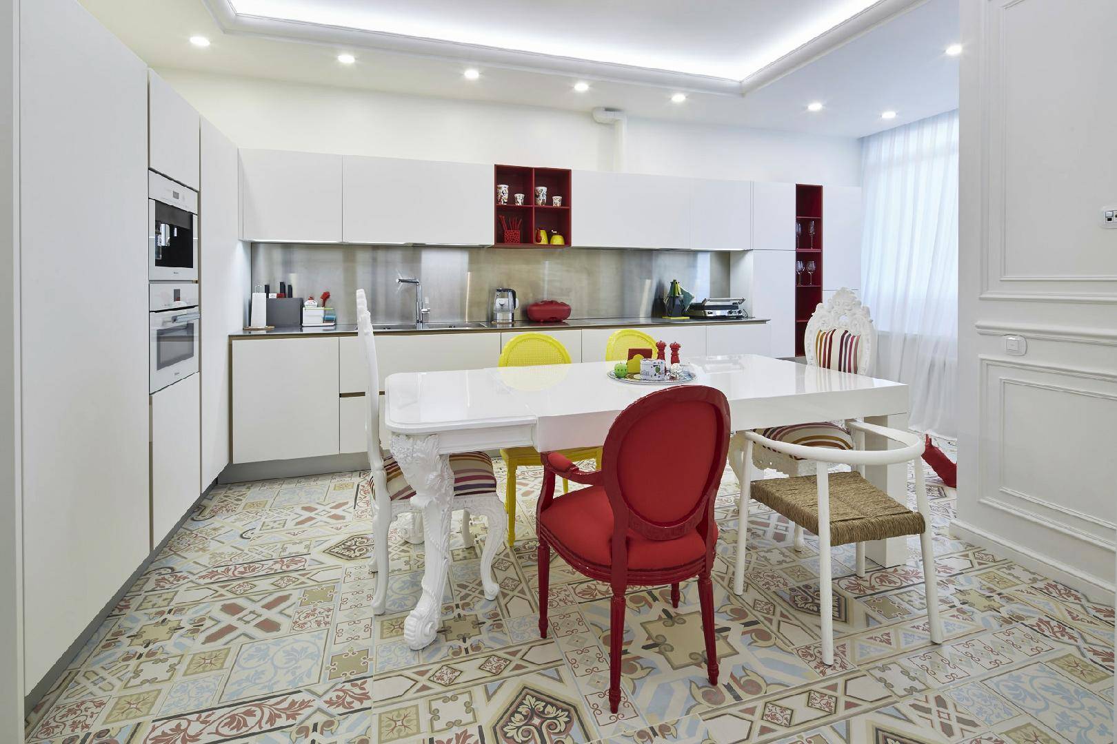 На современной кухне для контраста можно установить ретро-холодильник и тостер. Точно так же будут работать красный холодильник и чайник на фоне белоснежного классического гарнитура. Вариантов можно придумать сотни, от желтого бархатного кресла на фоне мебели в духе хай-тек и кирпичных стен до комплекта из разноцветных пластиковых (деревянных и прозрачных) стульев у обеденного стола, как в примере на фото.