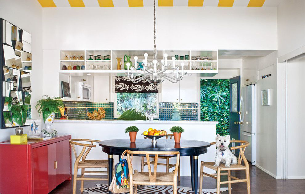 При работе с цветом нужно соблюдать одно из распространенных правил, которое подходит даже к этому свободному стилю: к любому яркому элементу декора, будь то кухонный фартук или стена, нужно подбирать несколько аксессуаров аналогичного оттенка. Достаточно всего пары деталей в виде чехлов, полотенец или ваз, чтобы цвет гармонично вписался в обстановку.