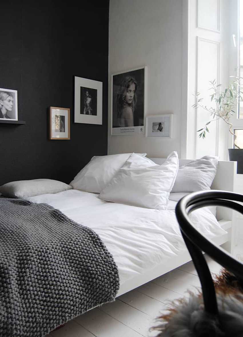 Так, если вы планируете превратить спальную комнату в место, где вы сможете брать силы и энергию для будущего рабочего дня, то можно разбавить белый цвет контрастным черным, что позволит добиться по-настоящему стильного эффекта.