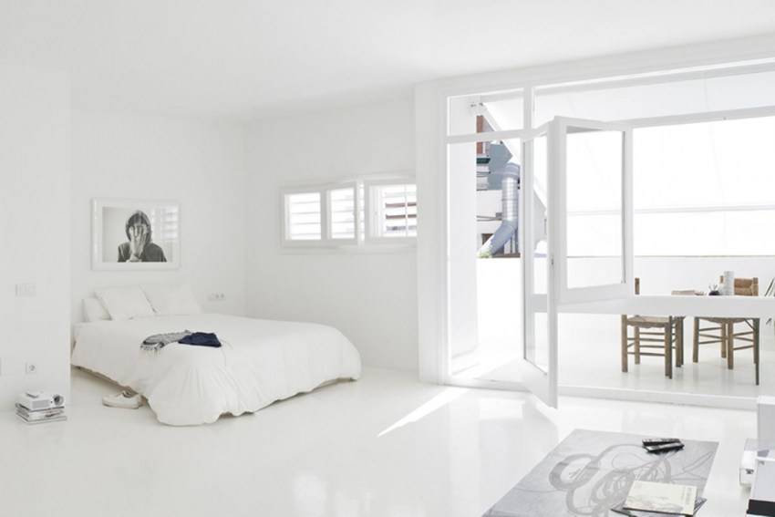 Белая спальня выглядит необычно за счет обилия отражаемого света. Для контраста можно использовать вазу с цветами или картину.