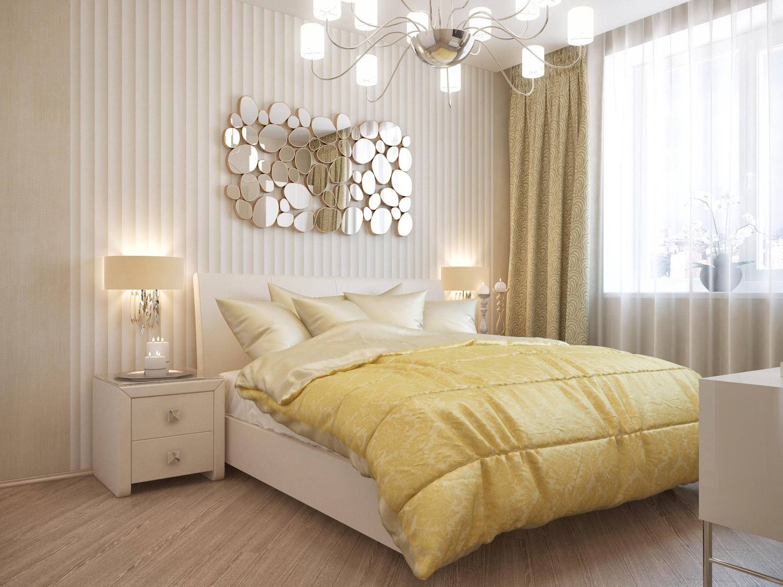 Спальня в светло-желтых тонах подойдет для современного стиля в сочетании с белым. Люстры и светильники должны быть с холодным светом, иначе комната будет слишком желтой.