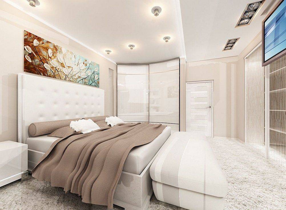 Для современного интерьера спальни в светлых тонах характерен минимальный декор, четкость линий в дизайне отделки и конструкции мебели, а также использование современных источников света. Кровать может быть классической или с бортиками, без изголовья. Здесь будет уместен шкаф-купе, открытые полки.