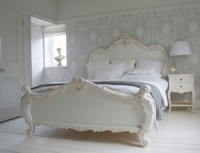 Классический интерьер спальни в светлых тонах сочетает роскошь барокко, ампира, викторианский стиль