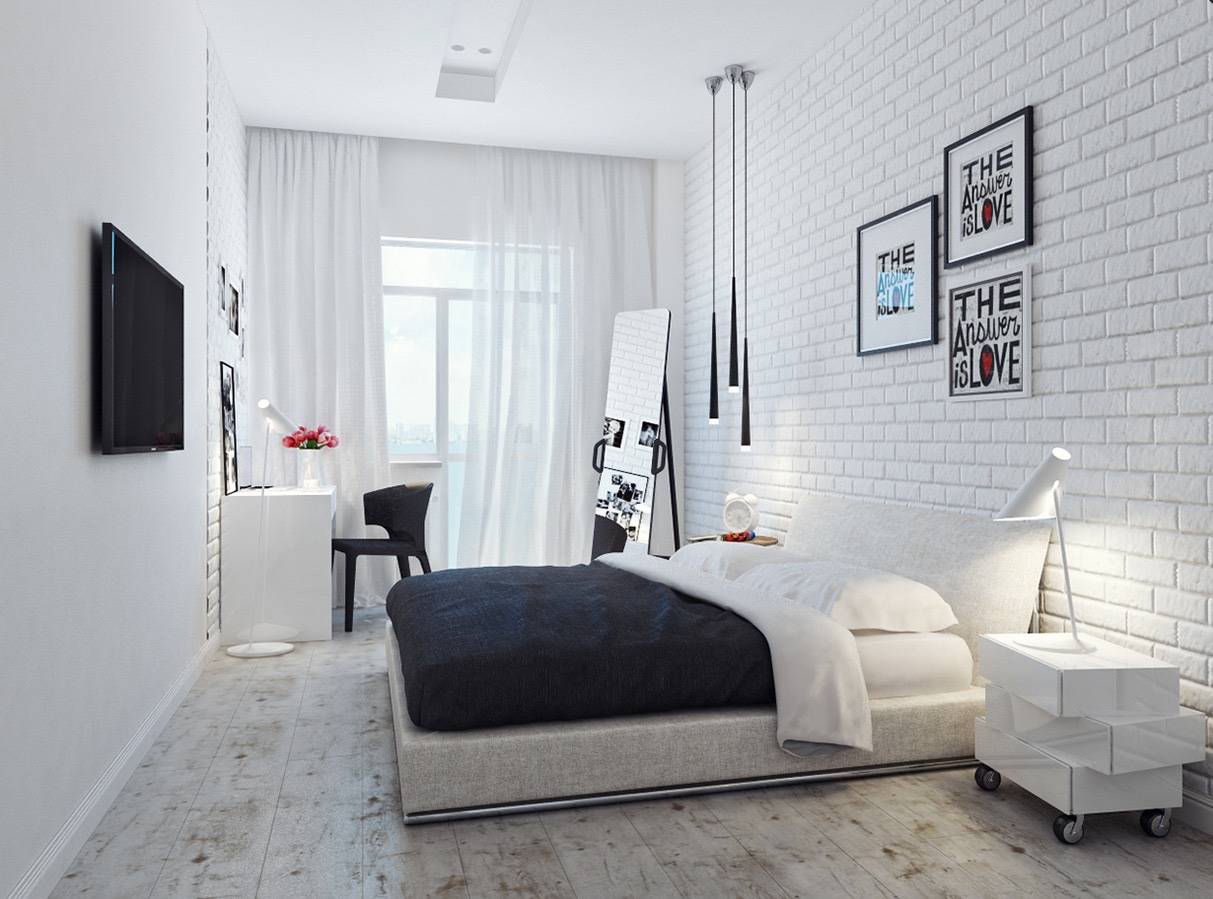 - разбавить контраст можно с помощь серых или красных акцентов (кровать, шкаф и т. д.);