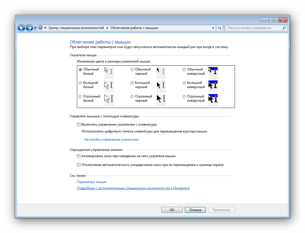 Для облегчения работы людей с ограниченными физическими возможностями система предлагает особый план настроек манипулятора. Он расположен в меню «ПускПанель управления/Специальные возможности/Изменение параметров мыши».