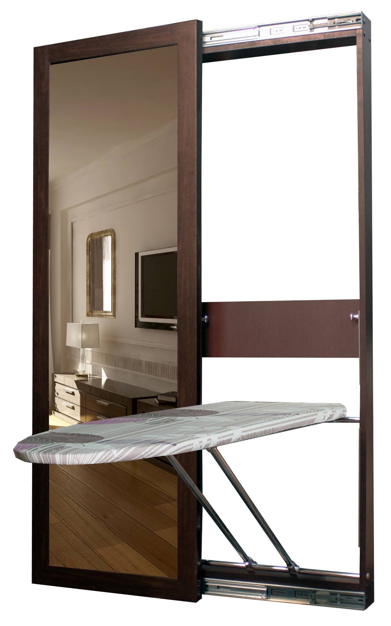 - Иногда хочется подвинуть ее поближе к телевизору или дивану, чтобы гладить белье, поглядывая любимую передачу. Встроенную гладильную доску нельзя перемещать по квартире.