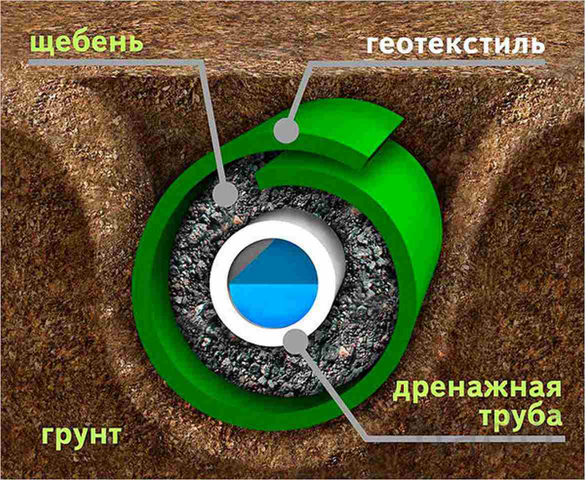 А чтобы система не засорялась, дрены оборачивают геотекстилем, который представляет собой полотно тонких синтетических волокон, не позволяющее илу или грунту попадать внутрь труб.