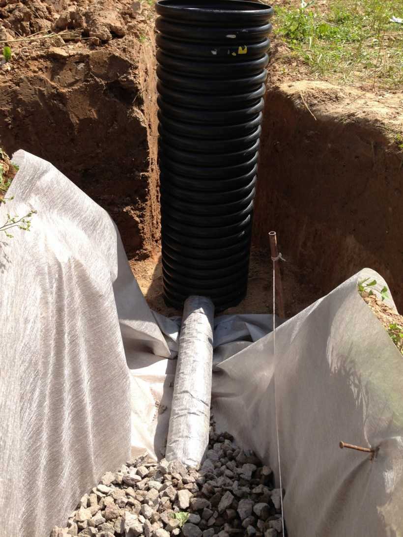 Выполняют подсыпку – 100-150 мм песка, проливают водой, затем 150-200 мм щебня, укладывают геотекстиль, затем укладывают и соединяют трубы, заворачивают трубы в геотекстиль, засыпают щебнем, затем песком. Укладку труб выполняют от колодца.