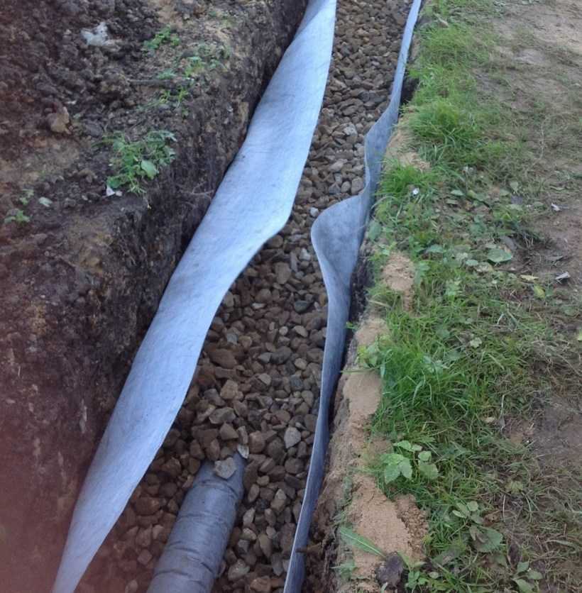 - Насыпка щебенки поверх труб и закрытие ее сверху краями геотекстильного полотна, которое будет отфильтровывать воду от взвешенных частиц, предотвращая тем самым заиливание системы.