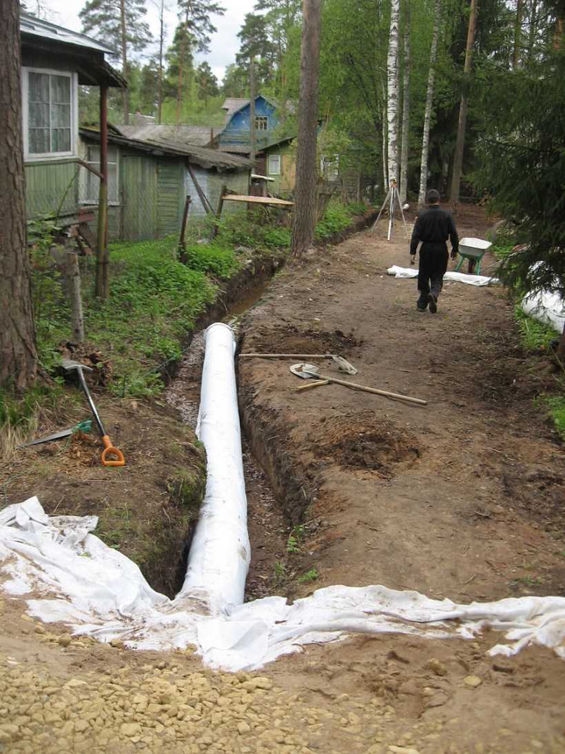 - Строительство закрытой дренажной системы требует большого объема земляных работ. В связи с этим, строить дренаж нужно еще до того, как на участке будут посажены деревья, а еще лучше – до того, как будет заложен фундамент строений.