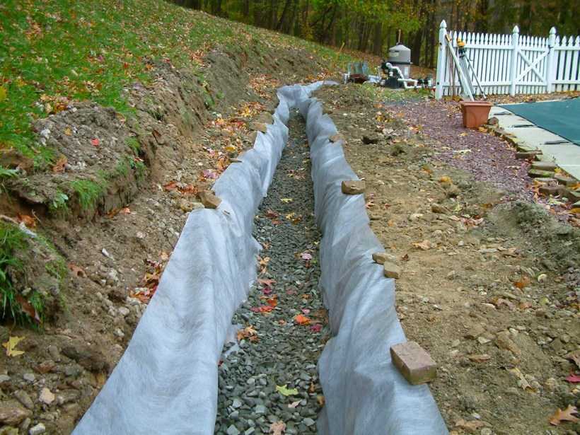 Простейший поверхностный дренаж представляет собой систему канав, выкопанных в земле. Для защиты от попадания растительного мусора их прикрывают досками, решетками или засыпают крупным щебнем. Открытые канавки быстро разрушаются водой, а щебень постепенно забивается песком и илом. Поэтому перед укладкой щебня канавки следует выстелить специальной дренажной тканью – геотекстилем, который легко пропускает воду, но задерживает механические включения.