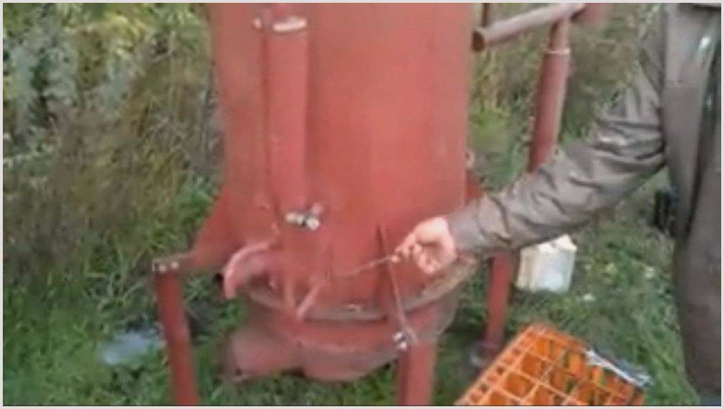 Если нужен сухой воздушный газ, то вентиль слива перекрывается, а вентиль на газовой трубе, расположившейся за сепаратором, открывается. Газ, попадая из небольшой трубы в большую трубу сепаратора, оставляет капли росы и направляется в территорию горения.