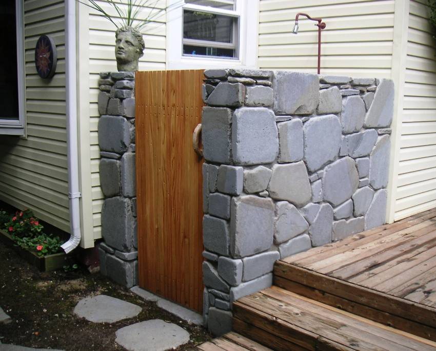 Оригинальный летний душ выложенный камнем, станет украшением любого загородного дома.