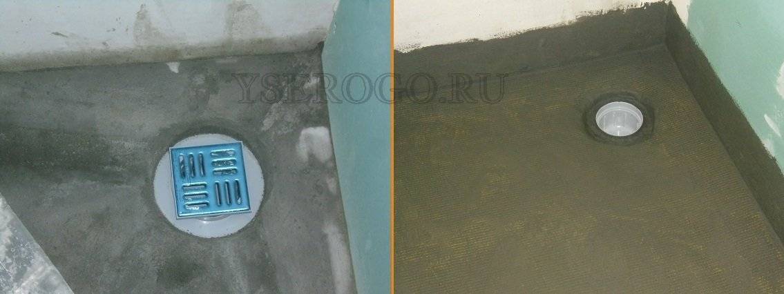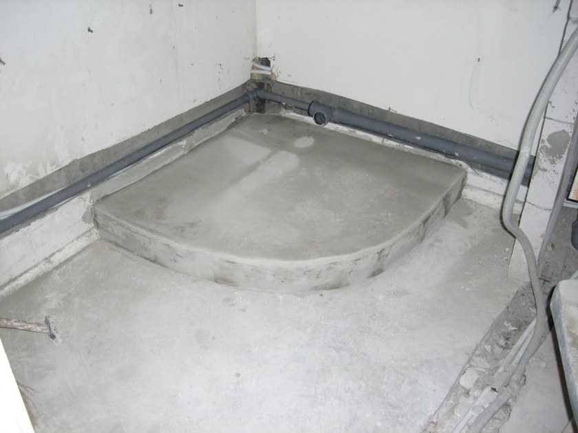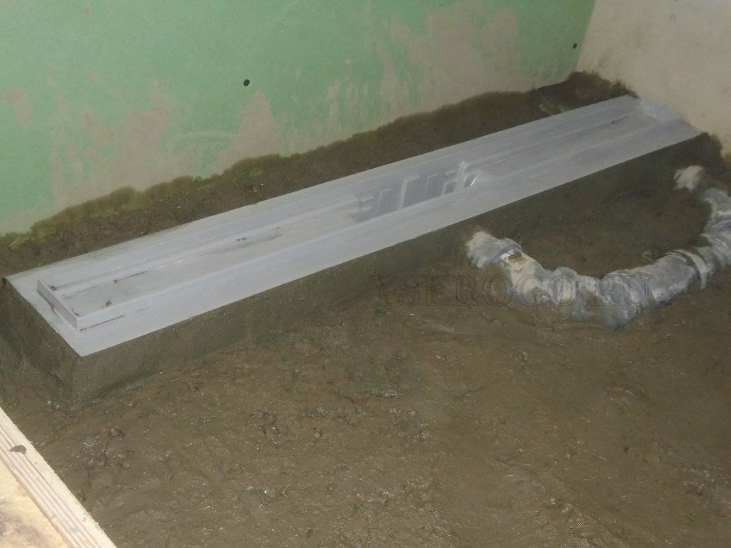 На этом фото душевой лоток, помимо комплектного крепежа в виде ножек, дополнительно закреплен цементным раствором. Делалось это во время заливки первого
