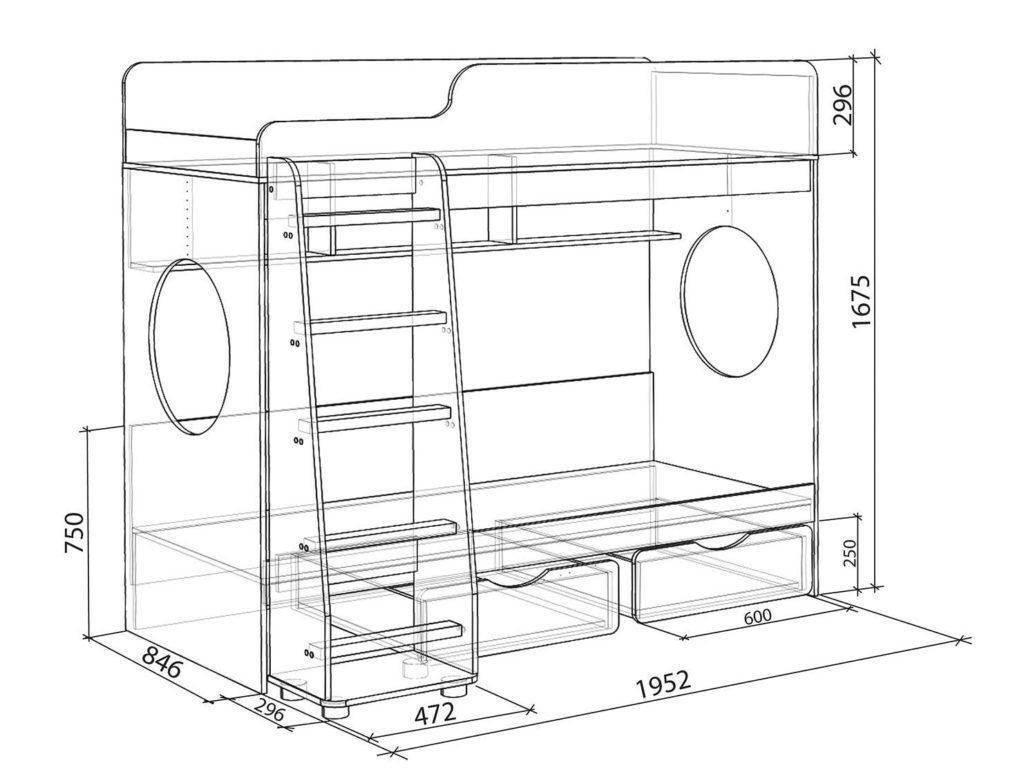 Начертите не только общий план с основными размерами, но и по отдельности изголовье, изножье, ложе и лестницу. Так вы сможете отобразить все детали и представить порядок сборки.