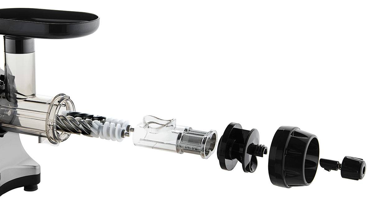 Двухшнековая соковыжималка мощнее, встречное вращение шнеков лучше затягивает сырьё и размельчает его. Такой аппарат отжимает больше сока, с мягкими плодами и зеленью, а также орехами он справляется лучше. С дополнительными насадками ему по силам сделать пасту, смузи, ореховое молоко или масло, сорбет.
