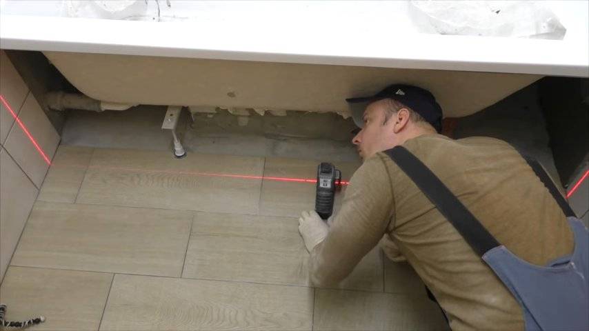 После того, как ванна с закрепленным снизу профилем установлена на место, приступают к монтажу каркаса. Для отбивания разметки удобно использовать лазерный осепостроитель, но если такого прибора нет, можно обойтись обычным строительным уровнем. Подробно нюансы выполнения разметки под каркас при помощи пузырькового уровня будут рассмотрены ниже.