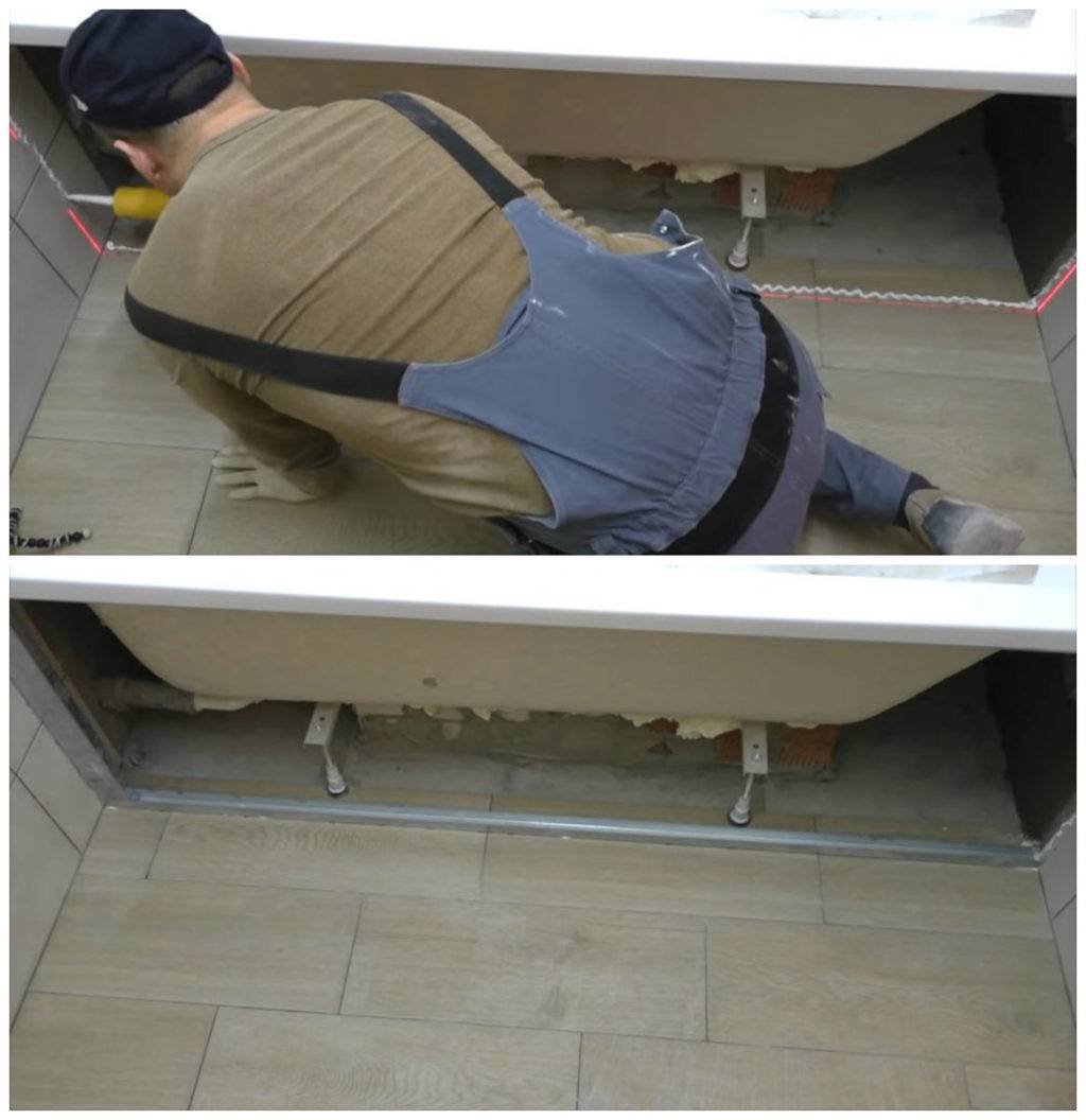 Акриловая ванна – достаточно хрупкий материал, поэтому если решено закрыть ее плиткой, нужно сделать так, чтобы ее передний бортик опирался на каркас, который собирается для выполнения обшивки. Это придает дополнительную жесткость и устойчивость чаше. Крепление профиля к ванне осуществляется через опорные бруски, которые приклеиваются при помощи силиконового герметика или клея «жидкие гвозди». Некоторые производители наклеивают опорные вкладыши в заводских условиях.