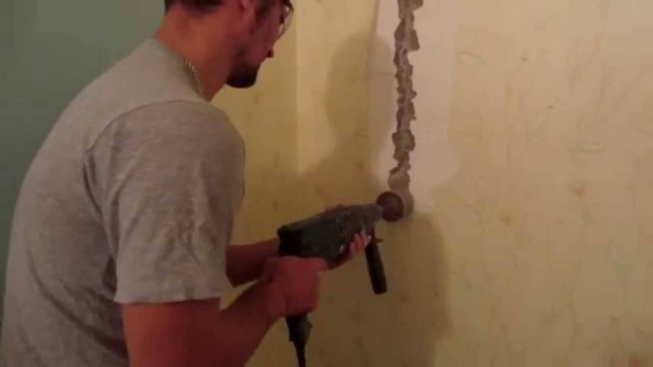- Теперь нам необходимо в эту точку вывести провод. Сделать это можно двумя способами. Штроблением стены в ванной или в смежном помещении. Последний вариант зачастую более предпочтительный, так как в ванной обычно лежит плитка. Поэтому сверлим в отмеченном месте сквозное отверстие, и от него выполняем штробление стены своими руками к необходимой нам распределительной коробке.