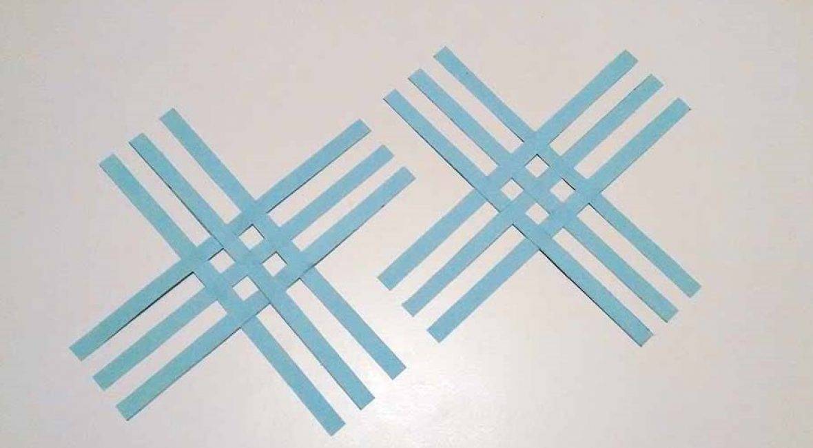 Снежинка состоит из двух половинок. То есть на одну половинку нужно 10 полосок. Первые две полоски склеиваю, так чтобы у меня получился крест. Затем я приклеиваю ещё две полоски.