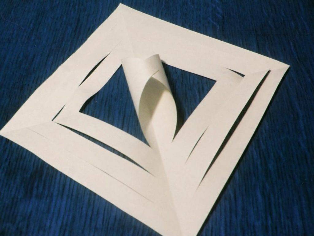 После начните вырезать по линиям, а дальше выполните надрезы и сверните их таким образом, как показано на этих рисунках. Сделать заготовку нужно в трех экземплярах, а после склейте их между собой. Выйдет стильно и очень ажурно, но и конечно же объемно, что несомненно всех обрадует.