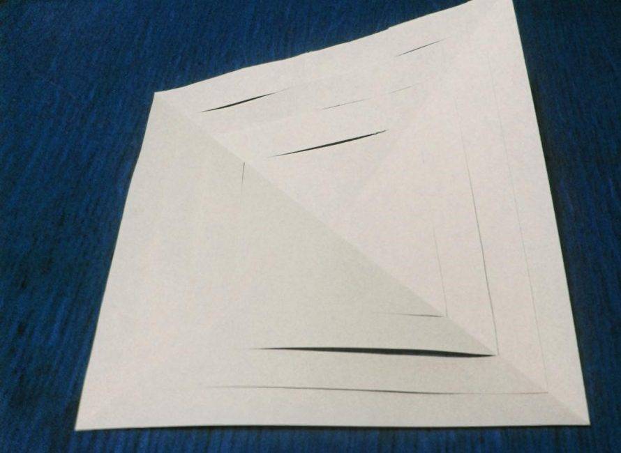 Теперь нам предстоит согнуть по диагонали шесть альбомных листов и сделаем надрезы по трафарету. У меня должно получиться 6 треугольников с разрезами, идущими параллельно друг другу.