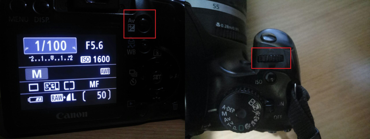 Нажмите на кнопку «Av», и параллельно с этим крутите колесико, как на изображении ниже. Это позволит вам увеличить/уменьшить значение диафрагмы.