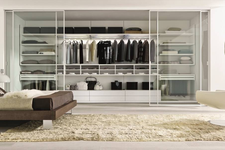 Система имеет компактные размеры и удобную раздвижную дверь, что делает этот вариант доступным для владельцев маленьких спален. При правильном зонировании внутреннего пространства можно сделать отдельные секции для обуви, одежды, аксессуаров.