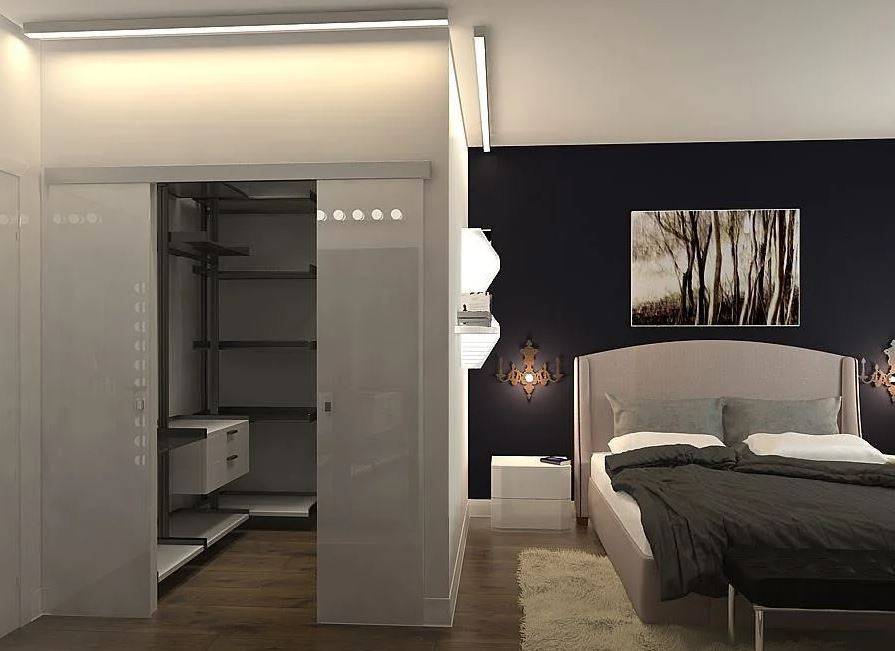 В некоторых квартирах планировка позволяет оборудовать вход в спальню через гардеробную. Для этого вокруг двери устанавливается конструкция с полками и другими системами хранения, образующая своеобразный коридор. Лучше выбирать закрытые ящики, чтобы одежда не покрывалась пылью.
