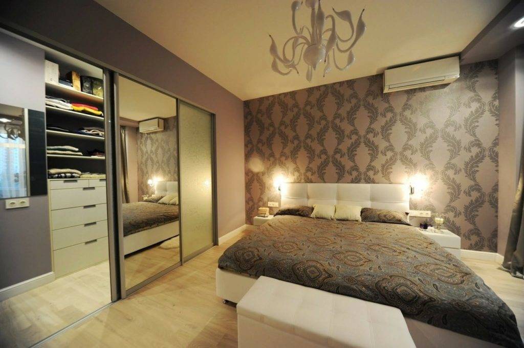 Если в планировке есть выступы, ниши, их можно рационально использовать для организации встроенной гардеробной в спальне. Например, дверь-купе скроет недостатки комнаты, станет изюминкой интерьера.