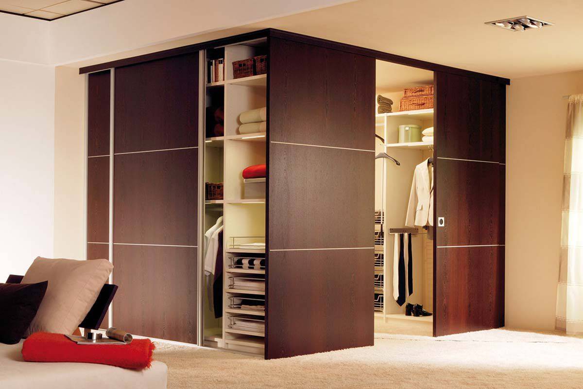 Система имеет компактные размеры и удобную раздвижную дверь, что делает этот вариант доступным для владельцев маленьких спален. При правильном зонировании внутреннего пространства можно сделать отдельные секции для обуви, одежды, аксессуаров.