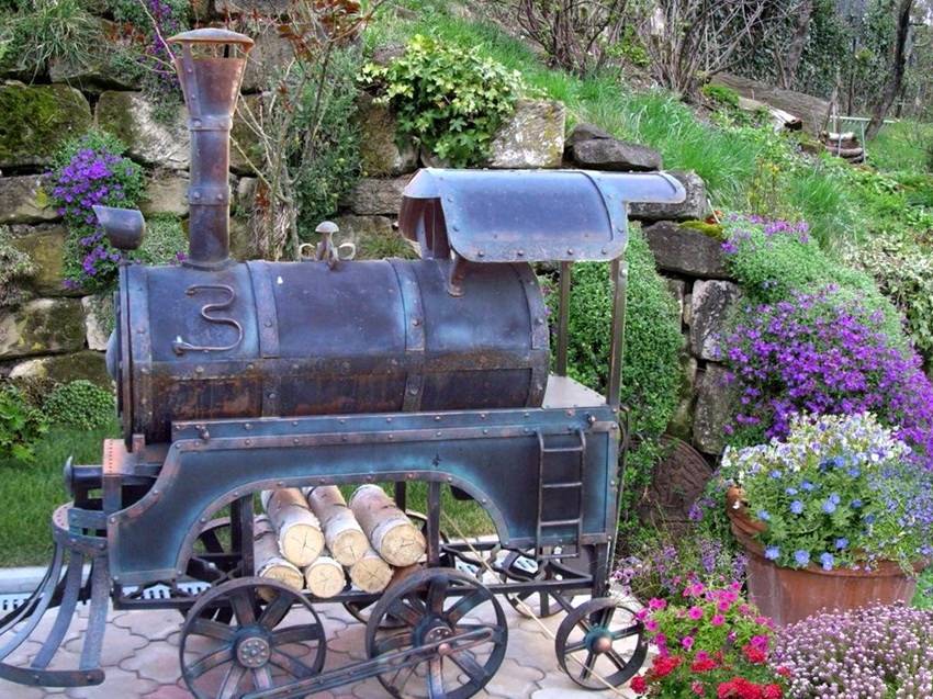 Еще одним уникальным сооружением является мангал-паровоз. Конструкция изготавливается из нескольких баллонов разного диаметра, бочек и магистральных труб. Такое изделие сочетает в себе мангал, коптильню, барбекю и гриль своими руками. Сооружение дополняется коваными элементами, которые придают конструкции оригинальный и эстетичный внешний вид.
