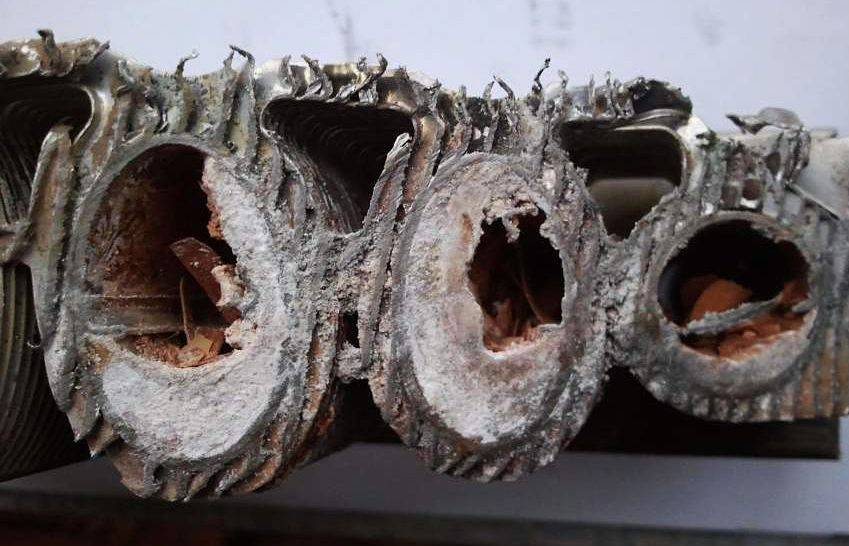 Теплообменник газового котла в разрезе. Использование загрязненного теплоносителя и отсутствие регулярной чистки привело к тяжелым последствиям: серьезный перегрев и практически полное засорение.