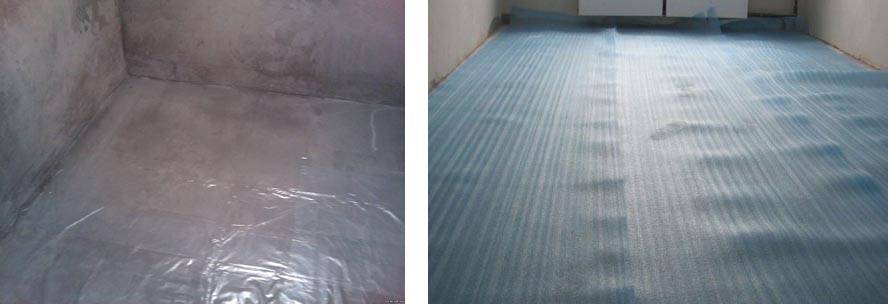 В качестве дополнительных мер защиты, на обустроенный изоляционный слой укладывается ПВХ- мембрана с напуском на стены в 15-20 см. В последствии, поверх мембраны будет произведена укладка подложки из вспененного полиэтилена или пробки.