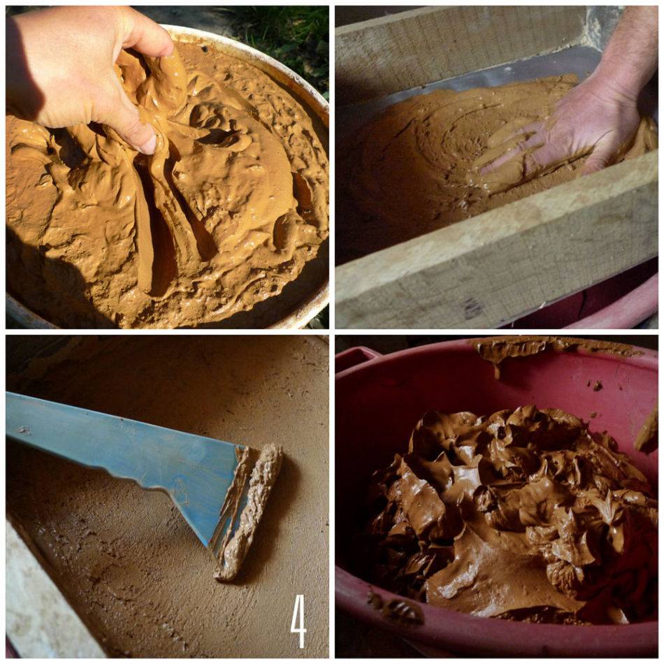 - Производится замес глины и песка с водой в четырех емкостях. Первая емкость содержит компоненты глины и песка в соотношении 4:1, в последующих 2:1, 1:1 и 1:1,5. Все смеси разводятся до одинаковой консистенции, делается 4 шарика и раскатываются из них лепешки. После чего они выкладываются в одно место и выдерживаются до полного высыхания. Тот образец, который не подвергся растрескиванию и имеет однородный состав, обладает наиболее идеальным соотношением компонентов.